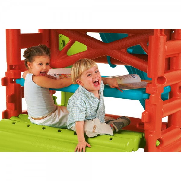 The Feber’s Wood House, is an inviting children’s playhouse that promises endless hours of outdoor play and fun. With features designed to stimulate imagination and physical activity, it is the perfect addition to any garden or outdoor space. Equipped with a slide and two side ladders for climbing up, this playhouse offers multiple play possibilities, allowing children to climb, slide and explore safely. The playhouse includes a bench that magically transforms into a sand box, providing additional space for creative play and manipulation. The materials used are resistant to sunlight and temperature variations, ensuring that the bright colors and appearance of the house remain unchanged over time.