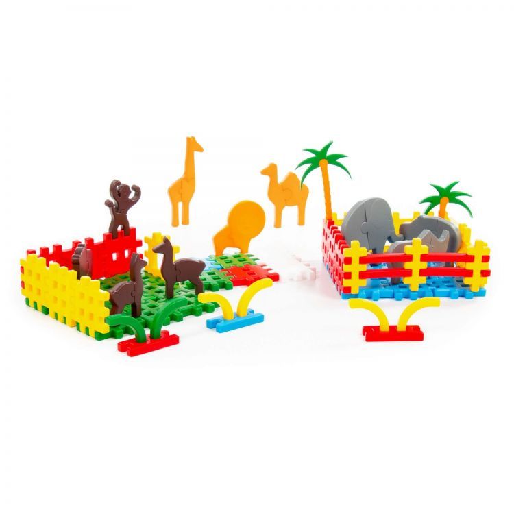 Playing with blocks our children develop their motor skills and creativity. This set will completely meet children’s expectations and allow them to build very realistic settings. ZOO pads are a set of 235 pieces. With this set our kids will build their own zoo and include: giraffe, elephant, lion, monkey, rhino, llama, bear, camel, trees, palms, and fences. Additional block levels allow for construction of the ground on which the previously mentioned elements are placed.